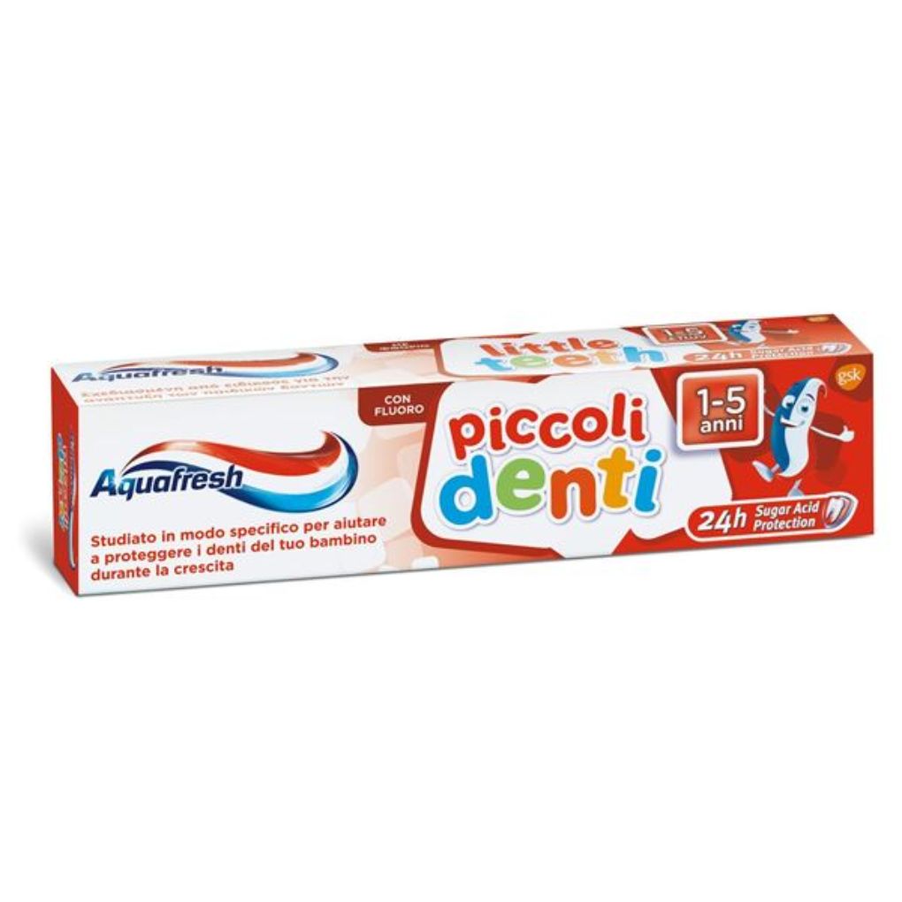 Aquafresh Small Teeth Toothpaste is suitable for children from 1 to 5 years. It is characterised by low abrasiveness and guarantees 24 hours protection from sugar acids thanks to fluoride.