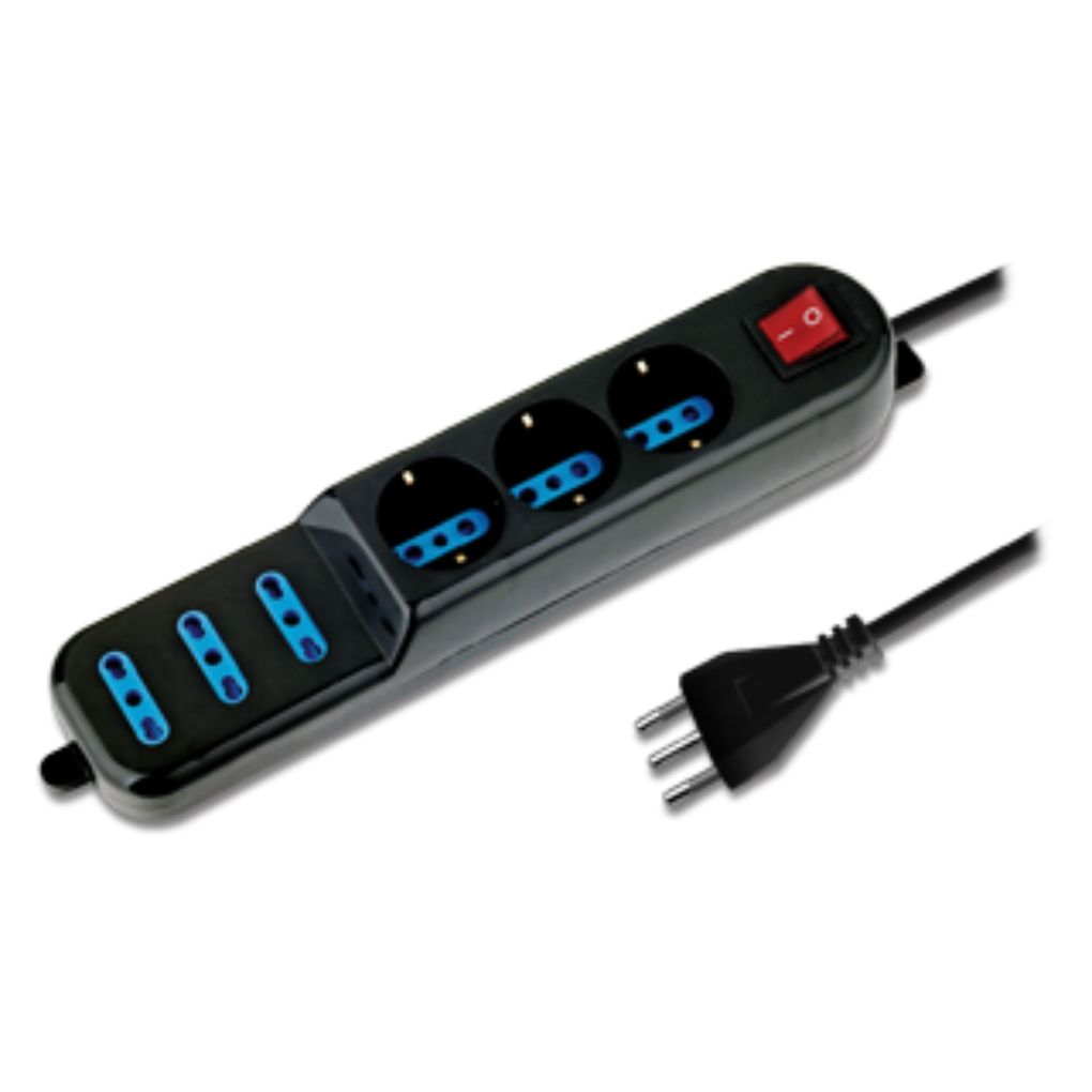 The Atlantis multi-socket strip is equipped with 6 sockets, including 3 Italian/European/Shuko and 3 with 10A/16A two-way connector. Practical to use to keep different devices within reach, this strip is equipped with child protection and can be connected via a 16A plug. Color: Black.
