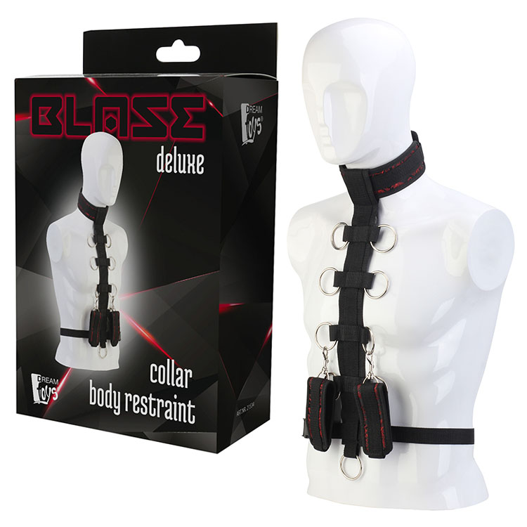 Body restraint harness with a detachable collar and cuffs, each with red embroidery