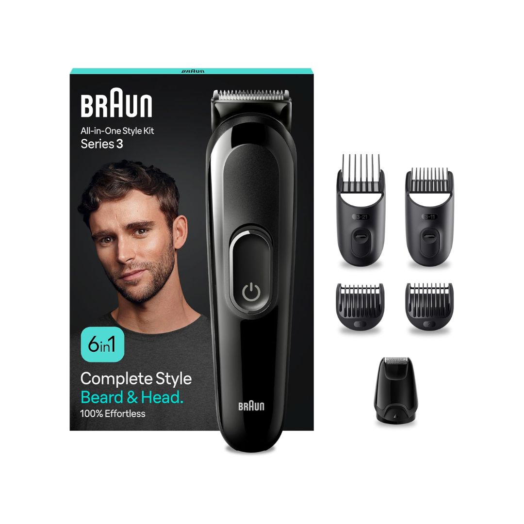 Braun’s 6-in-1 Styling Kit, for a perfect beard and face shave: accessories designed for beard trimming, precision shaving and home haircutting Your style, effortless: the ultra-sharp blade is efficient with every stroke, guarantees an unparalleled result even in the most difficult areas and a comfortable shave on the face and beard, and on the head Easy to use, no matter the length: an unrivalled shave with fixed combs of 1 mm and 2 mm and 2 sliding combs (3-21 mm) Ready to use: this men’s hair clipper is equipped with a powerful Ni-MH battery with a cordless 50-minute runtime