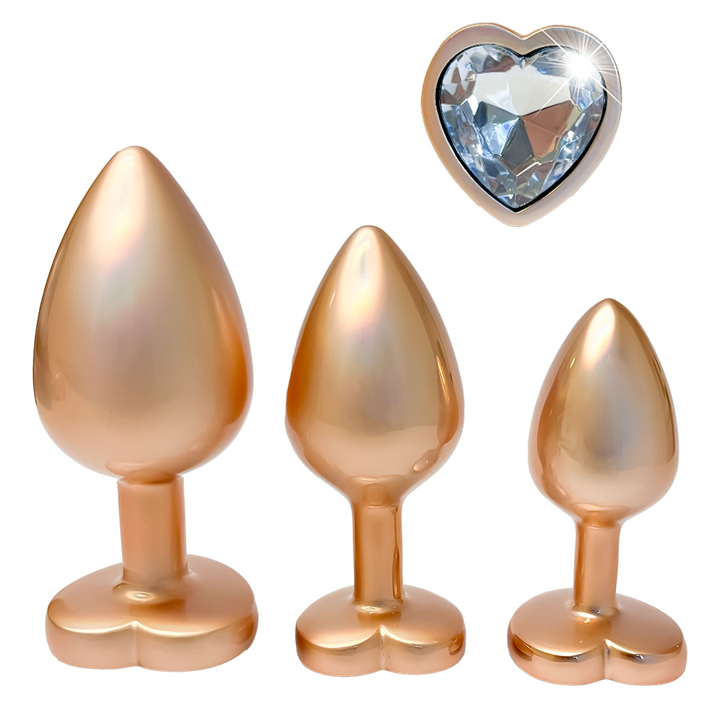 The Gleaming Love collection presents this set of gold pearl-finished anal plugs