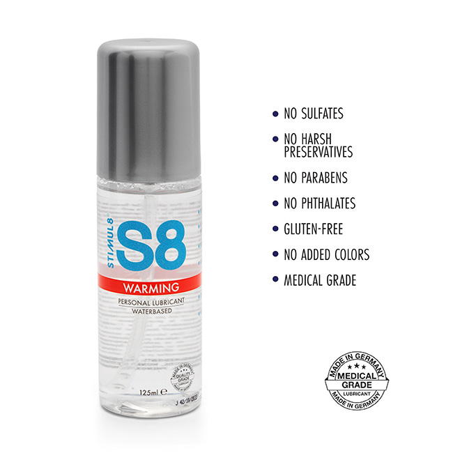 S8 Waterbase Warming Lubricant has a gentle warming effect on the skin, adding a